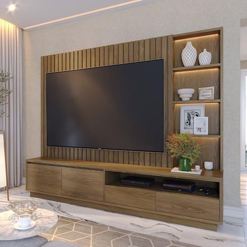 O Home Theater Cancún é a combinação perfeita de design contemporâneo e funcionalidade para o seu espaço de entretenimento. Com linhas retas e iluminação quente, o móvel destaca-se pelo painel superior com ripas largas, proporcionando uma sensação de volumetria. Adequado para TVs de até 82 polegadas, o home possui nichos decorativos com led, nicho inferior para aparelhos, duas gavetas com corrediças telescópicas e dois gavetões laterais, oferecendo uma solução completa para armazenamento. Transforme sua sala com o Home Cancún e desfrute de um ambiente elegante e funcional. Acabamento da Gaveta: Pintura UV Acabamento da Prateleira: Pintura UV Acompanha Lâmpada: 04 Ambiente Principal: Sala de Estar Complexidade da Montagem: Média: pode ser montado por mais de uma pessoa e/ou necessite de maior conhecimento para montagem Cor: Amendoa Cor do Produto: Amêndoa Escala de Brilho: Fosco Escala de Brilho da Prateleira: Fosco Gaveta com Chave: Não Ideal para TVs até (Polegadas): 79 Informações Complementares: 50Kg (no painel) Itens Inclusos: 1 Home, Kit Ferragens e Manual de Montagem Manual de Especificação Técnica: https://product-hub-prd.madeiramadeira.com.br/889523/documents/38dc62d0-2bd2-44d9-be28-5e9d38bcca061746077croqui31.pdf Manual de Montagem e Instalação: https://product-hub-prd.madeiramadeira.com.br/889523/documents/b960dedb-49c6-4522-9a2e-5a28b368cc7f1746076manual2636.pdf Material da Gaveta: MDP Material da Prateleira: MDP Material dos Pés: MDP Material Principal: MDP Necessita Montagem: Sim Origem do Produto: Nacional Peso: 156,9 kg Peso Máximo por Gaveta: 3 kg Peso Máximo por Prateleira: 3 kg Possui Espelho: Não Possui iluminação: Sim Possui Nichos: 05 Possui Pés: Rodapé Possui Portas: Não Possui Prateleiras: 03 Possui Rodízio: Não Recomendações de Uso, Manutenção e Limpeza: Limpar utilizando apenas pano umedecido com água, nunca utilizar abrasivos ou esponjas de aço. Sapatas Niveladoras: Não Sistema de Montagem: Cavilhas, Parafusos e Cola Suporta Até (kg): 50 kg Tipo de Puxador da Gaveta: Embutido