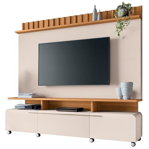 A Estante Home Theater Para 70 Pol 200cm Artemis B01 Off White Cinamomo, da Lyam Decor, vai transformar sua sala em um verdadeiro cinema! Com um design moderno e cantos arredondados, essa estante para sala é projetada para TVs de até 70 polegadas, o que deixará seu espaço muito mais imponente. Além disso, toda estrutura é fabricada com materiais de qualidade, e como destaque o tampo e prateleira superior recebem um plus, com espessura de 25mm, garantindo qualidade e durabilidade. Já o detalhe ripado confere um charme especial ao móvel, enquanto os puxadores metálicos em tom dourado adicionam um visual elegante. Para completar, os rodízios cromados de 50mm garantem mobilidade fácil e rápida, tornando essa estante home super versátil.