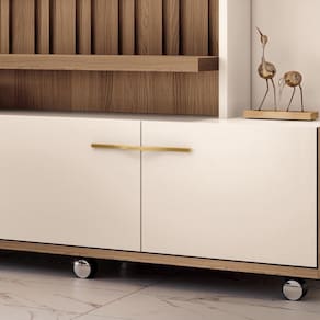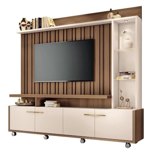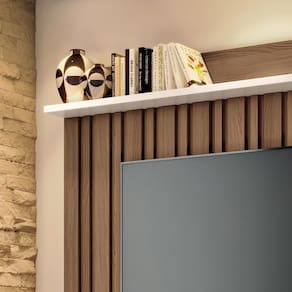 A Estante Home Theater Titan tem um visual marcante com o autêntico ripado, montado em larguras intercaladas. Possui 4 portas com dobradiças laterais e puxadores metálicos em tom dourado, nicho lateral com prateleiras de vidro 6mm, luminária de LED, rodízios cromados de 50mm, produzido em MDP e MDF com espessuras de 40mm, 25mm e 15mm.