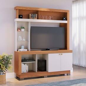 Estante Home Valenca, design elegante e funcional para transformar sua sala de estar. Estrutura em MDP/MDF (15 e 12mm) com acabamento em pintura UV texturizada. Possui portas de giro, nichos decorativos funcionais com espaço para auto falante, passa fios, prateleiras laterais em vidro (4mm), e pés plásticos (montagem opcional). Suporta com segurança TVs de até 50 polegadas. Este produto será entregue em 2 volumes.