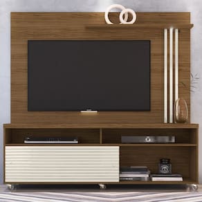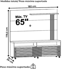 Estante Home Frizz, desenvolvida para aliar praticidade e acabamento com destaque frisado. Estrutura em MDP 15/25/40mm (base 15mm, prateleiras/frisos 25mm e tampo 40mm), com capacidade para TVs de até 65 polegadas (suporta até 90 kg distribuídos). Possui 02 nichos abertos, 01 prateleira superior com luminária LED embutida, além de frisos decorativos nas laterais. Conta também com 02 passa-fios, puxadores cromados (em metal) e 06 rodízios sem freio, (sendo 5 em silicone e 1 em plástico). Acabamento em pintura UV texturizada (fosca e brilho). Este móvel chegará separado em 02 volumes.