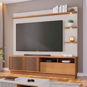 Estante Home Campeche, com design moderno alinhando espaço e personalidade para seu lar. Estrutura em MDF/MDP (12/15/25 mm) com acabamento em pintura UV texturizada. Composto por porta de correr com ripados artesanal (baixo relevo) com abertura por trilho U, gavetão com corrediças telescópicas, nichos decorativos funcionais, prateleiras laterais com Spots de LED já embutidos, passa fios e pés inclusos (montagem opcional 5 cm). Suporta TVs de até 70 polegadas com segurança. Este produto será entregue em 3 volumes.