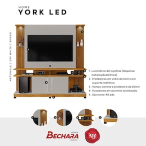 O home York led é deslumbrante. com seu designer moderno ele irá revitalizar sua sala. Robusto, conta com 2 prateleiras de vidro iluminadas por led fixos a uma prateleira superior. O led é acionado a toque, e alimentado por pilhas, com isso dispensa fiação elétrica, tornando-se muito mais prático para o uso. Possui também amplo tampo central e intermediário perfeito para acomodar os mais variados tipos de aparelhos eletrônicos. Possui 2 portas com puxador feito em alumínio anodizado que proporcionar ainda mais charme e requinte ao móvel. Além disso possui dois nichos em sua base ideal para acomodar home-theaters ou qualquer objeto de decoração que deseje, que pode ser distribuído com maior uniformidade pelo seu amplo tampo, prateleiras de vidro e nichos. Produto Montado: Sim Acabamento da Porta: Pintura UV Acabamento da Prateleira: Vidro Acompanha Lâmpada: Não Ambiente Principal: Sala de Estar codigo_ean: 7909903908235 Complexidade da Montagem: Média: pode ser montado por mais de uma pessoa e/ou necessite de maior conhecimento para montagem Cor: Naturalle/Off White Cor do Produto: Naturalle/Off White Escala de Brilho: Fosco Escala de Brilho da Porta: Semi-Brilho Escala de Brilho da Prateleira: Semi-Brilho Espessura do Vidro: 6 mm Ideal para TVs até (Polegadas): 60 Informações Complementares: Elaborado em MDP de espessura de 25mm para tampo central e prateleira, e MDP de espessura de 15mm para painéis, portas base e rodapé. Pintura da superfície em verniz poliéster semi-brilho, com secagem u. V. E impressão a laser com acabamento touch. Itens Inclusos: 1 Estante, 2 LEDs Acionado a Toque e Manual de Montagem. Linha ou Coleção: Tradicional Manual de Montagem e Instalação: cdn2.madeiramadeira.com.br/tecnico/moveis-bechara/280994-706-home-york-e-york-led-manual-de-montagem-ed001-pp01a08.pdf Material da Porta: MDP Material da Prateleira: Vidro Material do Puxador da Porta: Alumínio Material Principal: MDP Montagem Flex: Não Necessita Montagem: Sim Origem do Produto: Nacional Peso: 68,91 kg Peso Máximo por Prateleira: 1 kg Possui Espelho: Não Possui iluminação: Sim Possui Nichos: 02 Possui Pés: Não Possui Portas: Sim Possui Prateleiras: Sim Possui Vidro: Sim Recomendações de Uso, Manutenção e Limpeza: Recomenda-se limpar o produto com flanela ou pano macio seco, não utilizar produtos abrasivos, desengordurantes, álcool ou solvente. Mantê-lo em lugar livre de umidade e/ou exposição direta ao sol. Sistema de Montagem: Parafusos, Minifix e Cavilhas. Suporta Até (kg): 90 kg Tipo de Dobradiça/Corrediça da Porta: Alumínio Tipo de Puxador da Porta: Externo