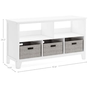 Marca: Martha Stewart? Fabricante: Guidecraft? Modelo: Martha Stewart Living & Learning Collection Kids’ Low Bookcase – Linen White (G76804)? Tipo de produto: Estante infantil baixa com nichos e cestos de tecido? Cor: Branco (Linen White / Creamy White)? Formato: Estrutura retangular com fundo fechado? Número de prateleiras: 2 prateleiras? Número de nichos frontais: 5 nichos tipo cubby? Cestos inclusos: 3 cestos de tecido? Dimensões do produto (L x P x A): 109 cm x 38 cm x 61 cm? Material da estrutura: Madeira de bétula e madeira engenheirada? Acabamento: Superfície branca de fácil limpeza com pano seco? Tipo de montagem: Piso (freestanding)? Capacidade de peso total: 159kg (capacidade informada como 350 lb)? Idade recomendada: 5 a 15 anos? Peso do pacote (produto + embalagem): 25,5kg Ambiente de uso indicado: Quarto infantil, brinquedoteca, sala de estar ou espaço de estudos? Cuidados de limpeza: Limpar com pano seco? Requer montagem: Sim, montagem pelo usuário adulto com ferramentas e ferragens incluídas? Conteúdo da caixa: 1 estante infantil baixa Martha Stewart Living & Learning Kids’ Low Bookcase, 3 cestos de tecido e kit de ferragens para montagem? Manual do usuário: Inglês? Marca: Não Informado