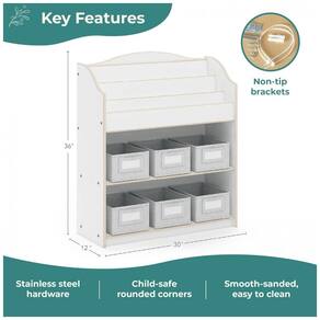 A estrutura é produzida em compensado de bétula com acabamento branco de fácil limpeza e bordas arredondadas, adequada para uso intenso em ambientes educativos. Na parte inferior, duas prateleiras largas acomodam seis caixas de tecido inclusas, ideais para guardar brinquedos, materiais de arte, jogos e outros recursos pedagógicos, mantendo o ambiente organizado e com tudo visível e acessível.?