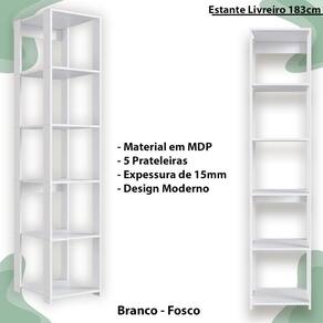Feito em MDP de 15mm com um sofisticado acabamento fosco. Além de ser prático, foi pensado para pessoas que buscam mais do que um simples móvel, mas sim uma peça que traz organização e modernidade ao dia a dia. Com 05 prateleiras espaçosas, cada uma delas suportando até 07kg. É ideal para ser usada em diversos cômodos e perfeita para espaços menores. Este móvel chegará em sua casa separado em 01 Volume.