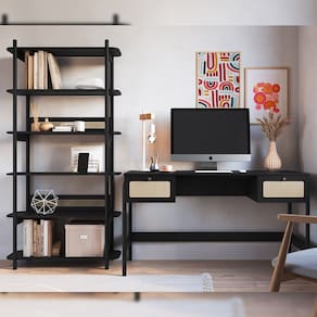 Com estrutura robusta, você terá amplo espaço para armazenar seus livros favoritos, exibir coleções e acomodar objetos de decoração que contam a sua história, enquanto a mesa para computador será o palco de grandes ideias e criações. Além disso, os pés em madeira maciça garantem não apenas resistência, mas também um toque de charme rústico que complementa qualquer ambiente. Para completar o charme, o aplique em tela sintética no painel traseiro da estante e nas duas gavetas da escrivaninha traz um toque artesanal, suave e acolhedor.
