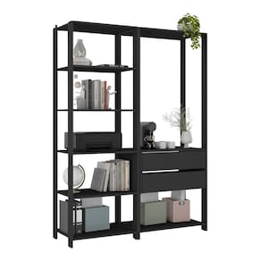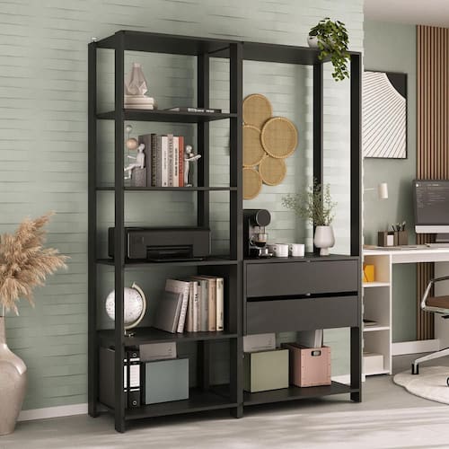 Espaço generoso e praticidade na rotina: É equipada com 7 prateleiras espaçosas que suportam até 8kg em cada, ideais para acomodar livros, documentos e materiais de trabalho. A estante oferece espaço para colocação de impressora e até para um cantinho do café, tornando a sua rotina mais dinâmica e descomplicada. Além disso, com 2 gavetas que possuem corrediças metálicas, o manuseio dos itens ganha leveza e praticidade.