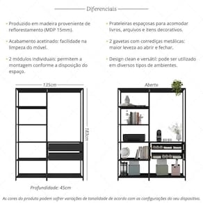 Especificações Técnicas: Dimensões do Produto Montado - Altura: 183cm | Largura: 135cm | Profundidade: 45cm Material: MDP 15mm Acabamento: Acetinado Quantidade de Prateleiras: 7 Quantidade de Gavetas: 2 Corrediças: Metálicas