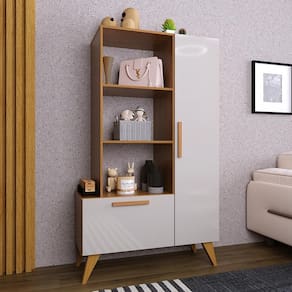 Com design retrô e funcional, a Estante Livreiro 6213 é perfeita para compor diversos ambientes. Produzida em MDP com pintura UV, possui 1 porta com dobradiças metálicas, 1 gaveta com corrediças metálicas e puxadores em MDF. Seus pés de madeira com 20cm completam o visual vintage. Ideal para livros, objetos decorativos e organização. Suporta até 43kg distribuídos.
