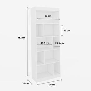 A Estante Multiuso é perfeita para quem busca organização com estilo e praticidade. Composta por 4 prateleiras bem distribuídas, oferece amplo espaço para acomodar livros, objetos decorativos, utensílios ou materiais de trabalho de forma acessível e visualmente agradável. Fabricada em MDP resistente, apresenta um design moderno e versátil que se adapta facilmente a diversos ambientes, como salas, escritórios, quartos ou até mesmo áreas de estudo. Uma peça funcional e elegante para deixar tudo no lugar com personalidade. CARACTERÍSTICAS TÉCNICAS: - Estrutura em MDP de 15 mm - Acabamento Fosco cor Branco - Dispõe de 9 Nichos e 4 Prateleiras - Suporta 5 kg por Prateleira INFORMAÇÕES TÉCNICAS: Altura: 182 cm Largura: 70 cm Profundidade: 30 cm Peso: 21 kg INFORMAÇÕES ADICIONAIS: -ATENÇÃO: Não trabalhamos e não nos responsabilizamos pela montagem do móvel. Antes da montagem conferir se o produto está de acordo com o que comprou, produto montado e danificado pela montagem não será aceito troca. -As imagens ambientadas são meramente ilustrativas e podem apresentar itens que não compõe o produto. As cores do produto podem variar de acordo com o monitor, a iluminação do ambiente ou sua percepção visual. -Limpeza: Deve ser feita com pano macio e seco ou levemente umedecido com água e sabão neutro. Não devem ser utilizados abrasivos como palha de aço e objetos cortantes. Garantia para defeitos de fabricação conforme Código de Defesa do Consumidor.