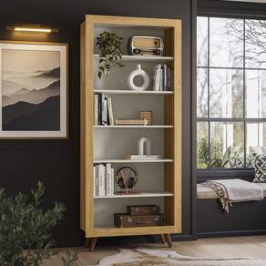 Estante Livreiro Retrô 6 Prateleiras - Qmovi A Estante Livreiro Retrô se destaca como um elemento essencial para a organização diária. Suas prateleiras ajustáveis oferecem flexibilidade para armazenar objetos variados, desde os essenciais do cotidiano até peças decorativas que expressam sua personalidade. Seu design marcante, com molduras elegantes e pés de madeira maciça no estilo retrô, é a escolha perfeita para quem busca um toque de modernidade e sofisticação no ambiente.