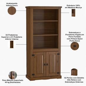 Combinando a beleza das portas com design em almofada em alto-relevo com a praticidade de 3 prateleiras internas essa estante de madeira é ideal para guardar livros, decorações ou objetos de uso diário com fácil acesso e protegidos da poeira. Além disso, os puxadores de argola em ferro e a estrutura em pinus maciço garantem durabilidade e um visual rústico sofisticado. Perfeita para sua sala, home office ou quarto, essa estante multiuso oferece a solução de organização que você procura, sem abrir mão do estilo.