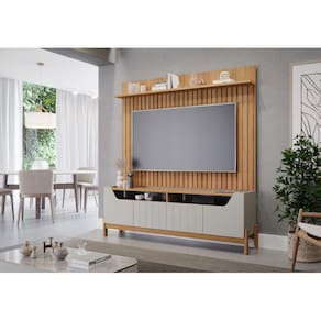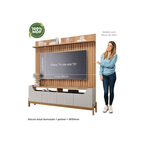 Tenha em sua sala esse lindo painel ripado com a bancada com um amplo espaço com 4 portas. Deixe tudo lindo e organizado com um espaço para colocar TV de até 70", a bancada conta com portas com detalhe em baixo relevo, e a fabricação é em MDF.