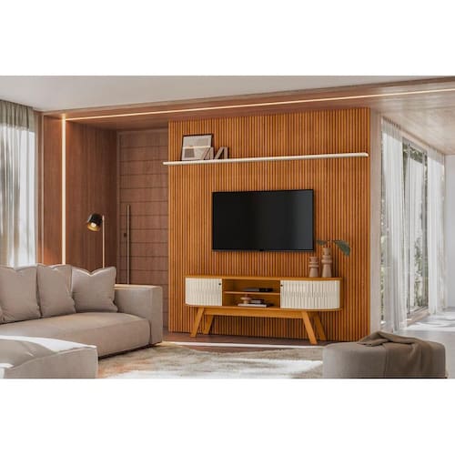 A Composição New Laguna é a perfeita combinação entre elegância e funcionalidade, ideal para transformar sua sala em um ambiente moderno e acolhedor. Fabricada com estrutura em MDP e MDF de 12, 15 e 25mm, a composição possui acabamento em pintura UV, garantindo durabilidade e sofisticação. Suas dimensões são de 2,380 x 2,445 x 0,185m para o painel e 1,830 x 0,690 x 0,380m para a bancada, oferecendo amplo espaço e suporte para TVs de até 75 polegadas. O painel apresenta um sofisticado frisado em MDF com design em baixo relevo, enquanto a bancada se destaca pelo tampo e base com detalhes curvos, agregando modernidade ao conjunto. Com duas portas flexíveis em MDF, duas prateleiras para organização adicional e puxadores em poliestireno, o design alia praticidade e estilo. Os pés retrô complementam o visual com charme, proporcionando estabilidade e uma estética diferenciada. A entrada para TV é de 2,380 x 1,200mm no painel e 1,830 x 0,380m na bancada, garantindo funcionalidade e espaço ideal para o seu equipamento. O sistema de montagem Girofix facilita a instalação, tornando a Composição New Laguna uma escolha inteligente para quem busca um mobiliário sofisticado e prático.