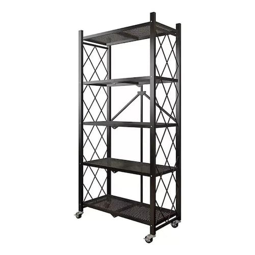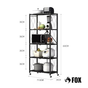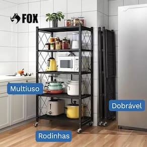 Marca: Fox Modelo: 5 níveis Cor: Preta Material: Aço Dobrável: Sim Rodinhas: Sim Peso suportado: aproximadamente 10kg por prateleira
