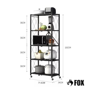 Marca: Fox | Modelo: 5 níveis | Cor: Preta | Material: Aço | Dobrável: Sim | Rodinhas: Sim | Peso suportado (Aproximado por prateleira): 10kg