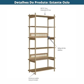 O Estante com 6 Prateleiras Oslo é confeccionada em MDP com acabamento BP, pés de madeira maciça e aplique de tela sintética. Móvel multifuncional que facilita na hora de organizar e armazenar diversos objetos. Traz como característica um traço artesanal, suave e acolhedor. Com design escandinavo minimalista, remete em suas linhas retas a simplicidade, charme e funcionalidade que sua casa merece. Composta com uma paleta de cores neutras, onde refletem as paisagens nas quais a linha foi inspirada, tornando-se assim a opção ideal para um ambiente com toque sofisticado e ao mesmo tempo aconchegante.