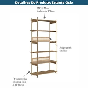O Estante com 6 Prateleiras Oslo é confeccionada em MDP com acabamento BP, pés metálicos e aplique de tela sintética. Móvel multifuncional que facilita na hora de organizar e armazenar diversos objetos. Traz como característica um traço artesanal, suave e acolhedor. Com design escandinavo minimalista, remete em suas linhas retas a simplicidade, charme e funcionalidade que sua casa merece. Composta com uma paleta de cores neutras, onde refletem as paisagens nas quais a linha foi inspirada, tornando-se assim a opção ideal para um ambiente com toque sofisticado e ao mesmo tempo aconchegante.