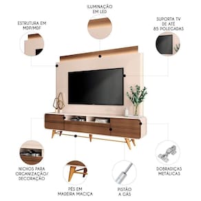 Com um Design Moderno e inovador, essa Estante para Sala, além de suportar TVs de até 85 polegadas, ainda adiciona um toque de sofisticação ao ambiente, tornando-se um ícone decorativo para a sua Sala de Estar. Os pés de madeira maciça torneados fazem referência ao estilo retrô, enquanto os cantos curvos, a iluminação de LED e os filetes decorativos são elemento essenciais. Para completar, as 3 portas oferecem espaço de armazenamento adicional, permitindo deixar a Bancada livre de bagunças, os nichos centrais servem para instalar os demais aparelhos eletrônicos ou até mesmo exibir seus itens decorativos favoritos. Com essa estante, você terá um espaço de entretenimento em casa que combina funcionalidade e estilo. Transforme sua sala em um ambiente elegante, perfeito para desfrutar de seus filmes e programas favoritos.