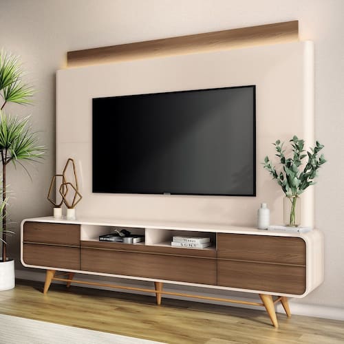 Com um Design Moderno e inovador, essa Estante para Sala, além de suportar TVs de até 85 polegadas, ainda adiciona um toque de sofisticação ao ambiente, tornando-se um ícone decorativo para a sua Sala de Estar. Os pés de madeira maciça torneados fazem referência ao estilo retrô, enquanto os cantos curvos, a iluminação de LED e os filetes decorativos são elemento essenciais. Para completar, as 3 portas oferecem espaço de armazenamento adicional, permitindo deixar a Bancada livre de bagunças, os nichos centrais servem para instalar os demais aparelhos eletrônicos ou até mesmo exibir seus itens decorativos favoritos. Com essa estante, você terá um espaço de entretenimento em casa que combina funcionalidade e estilo. Transforme sua sala em um ambiente elegante, perfeito para desfrutar de seus filmes e programas favoritos.