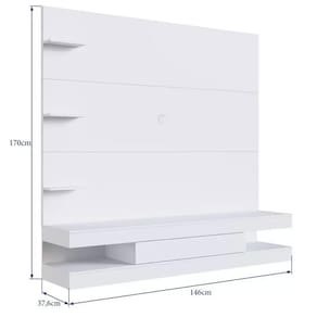 Garantia: 90 dias / Peso: 48,8kg / Cor predominante: branco / Referência: 7898970136132 Dimensões: 146cm (C) x 37,5cm (L) x 170cm (A); Espessura da madeira: 15mm; Quantidade de nichos inferiores: 02; Quantidade de prateleiras laterais: 03; Quantidade de gavetas: 01; Itens Inclusos: 01 home, kit de ferragens e manual de montagem; Materiais: madeira MDP e metal.