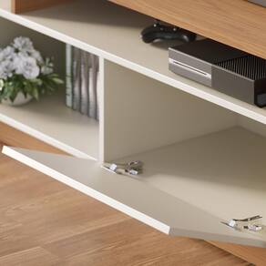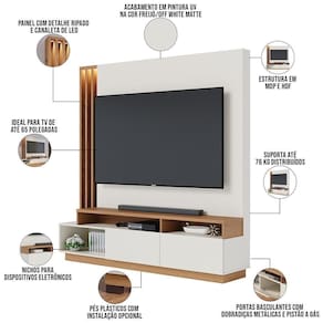 Com linhas retas e design minimalista, essa estante home comporta televisores de até 65 polegadas no painel, além dos espaços extras nos nichos para os demais aparelhos eletrônicos, enquanto o compartimento interno das portas garante a organização. Já o charme fica por conta do detalhe ripado na lateral do painel para , que recebe destaque da iluminação LED e transmite um ar acolhedor.