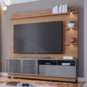 Cada detalhe transmite uma sensação marcante: os spots de led nas prateleiras projetam tranquilidade e aconchego; já a porta deslizante ripada dá um toque de modernidade, enquanto as linhas retas garantem o minimalismo. Além disso, o painel de TV confere um ar imponente, uma vez que foi projetado para receber aparelhos de até 70 polegadas, ideal para criar no seu espaço uma sala de cinema. Para completar, os nichos e a gaveta com corrediças telescópicas são ideais para organização de aparelhos eletrônicos e demais objetos decorativos.