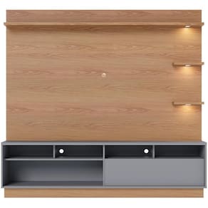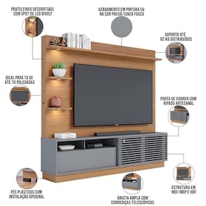 Cada detalhe transmite uma sensação marcante: os spots de led nas prateleiras projetam tranquilidade e aconchego; já a porta deslizante ripada dá um toque de modernidade, enquanto as linhas retas garantem o minimalismo. Além disso, o painel de confere um ar imponente, uma vez que foi projetado para receber aparelhos de até 70 polegadas, ideal para criar no seu espaço uma sala de cinema. Para completar, os nichos e a gaveta com corrediças telescópicas são ideais para organização de aparelhos eletrônicos e demais objetos decorativos.