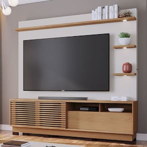 Cada detalhe transmite uma sensação marcante: os spots de led nas prateleiras projetam tranquilidade e aconchego; já a porta deslizante ripada dá um toque de modernidade, enquanto as linhas retas garantem o minimalismo. Além disso, o painel de TV confere um ar imponente, uma vez que foi projetado para receber aparelhos de até 70 polegadas, ideal para criar no seu espaço uma sala de cinema. Para completar, os nichos e a gaveta com corrediças telescópicas são ideais para organização de aparelhos eletrônicos e demais objetos decorativos.