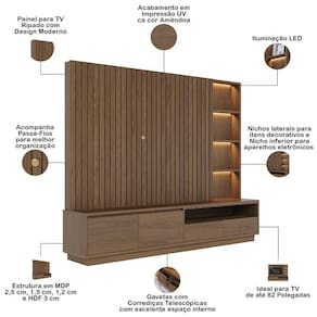 Com um design robusto e funcional, essa estante para TV será o ponto alto da sua sala de estar, a começar pelo painel ripado que comporta TVs de até 85 polegadas; já os nichos laterais, ideais para decoração, ganham um toque de sofisticação com a iluminação LED. Por sua vez, as gavetas oferecem um amplo espaço de armazenamento, de modo que a bancada da estante fique sempre organizada. Para completar, o nicho maior é recomendado para os demais dispositivos eletrônicos, a fim de manter cada item em seu devido lugar.