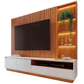 O nicho inferior foi pensado especialmente para acomodar aparelhos eletrônicos, oferecendo fácil acesso. Para completar, o painel ripado adiciona textura e sofisticação ao design, conferindo um visual moderno e marcante à estante.