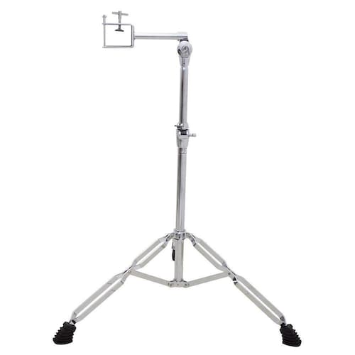 Estante para bongô profissional possui um acabamento cromado, ferragem dupla pesada, três pés emborrachados e altura ajustável.