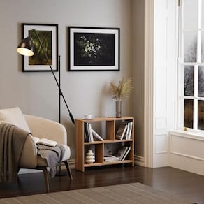 Possui compartimentos projetados para organizar livros, objetos decorativos e outros itens essenciais, mantendo tudo ao alcance das mãos para qualquer ocasião.