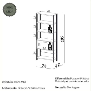 A estante Dalla Costa possui 1 torre basculante medindo 73cm - produzida 100% em MDF na cor off white/freijófosco e para maior durabilidade é aplicado 6 camadas de pintura UV. A Estante Torre é um móvel versátil, que pode ser utilizado de várias maneiras e locais: na sala, no quarto ou no escritório. Seu design moderno se adapta aos ambientes, podendo servir de estante para livros ou apenas acomodando peças de decoração. Com cores que favorecem a combinam com outras mobílias. Conheça toda linha da Dalla Costa Produto Montado: Sim Acabamento da Gaveta: Pintura UV Acabamento da Prateleira: Pintura Ambiente Principal: Sala de Estar codigo_ean: 7900288152305 Complexidade da Montagem: Baixa: pode ser montado por uma pessoa sozinha Cor: Freijó / Off White Cor do Produto: Freijo / Off White Cor Interna: Off White Escala de Brilho: Brilhante Escala de Brilho da Gaveta: Brilhante Escala de Brilho da Prateleira: Brilhante Gaveta com Chave: Não Itens Inclusos: 1 Estante e Manual de Montagem Manual de Montagem e Instalação: https://product-hub-prd.madeiramadeira.com.br/701166197/documents/396f19f6-77b4-40ac-9aa1-e485896baaeb2933856378117473973923314.pdf Marca: Pradel Móveis Material da Gaveta: MDF Material da Prateleira: MDF Material do Puxador da Gaveta: Plástico Material Principal: MDF Necessita Montagem: Sim Origem do Produto: Nacional Peso: 24 kg Peso Máximo por Gaveta: 5 kg Peso Máximo por Prateleira: 5 kg Possui Acabamento na Parte de Trás: Sim Possui Espelho: Não Possui iluminação: Não Possui Pés: Não Possui Portas: Não Possui Prateleiras: Sim Possui Rodízio: Não Possui Vidro: Não Quantidade de Gavetas: 01 Gaveta Recomendações de Uso, Manutenção e Limpeza: Limpeza com pano levemente umedecido Sapatas Niveladoras: Não Sistema de Montagem: Minifix, parafuso e cavilhas Suporta Até (kg): 20 kg Tipo de Corrediça da Gaveta: Metálica Simples Tipo de Puxador da Gaveta: Externo