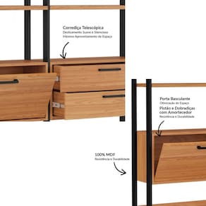 Características: Estrutura 100% MDF Acabamento em Pintura UV Prateleiras Leves e Resistentes 01 Porta Basculante com Pistão e Dobradiças de Amortecimento 02 Gavetas com Corrediças Telescópicas Puxadores Plásticos Estilo Industrial Sapatas PVC