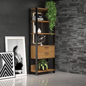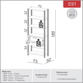 Características: Estrutura 100% MDF Acabamento em Pintura UV Prateleiras Leves e Resistentes 02 Gavetas com Corrediças Metálicas Puxadores Plásticos Estilo Industrial Sapatas PVC