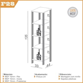 Características: Estrutura 100% MDF Acabamento em Pintura UV Prateleiras Sapatas Plásticas Estilo Industrial