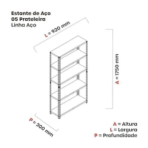 Estante de aço Pandin tem a melhor qualidade do mercado, porque são confeccionadas em chapas #20 e #26 (0,90mm e 0,45mm) priorizando sempre a qualidade, segurança e bem-estar no dia a dia dos nossos clientes. Produto Montado: Sim Acabamento da Prateleira: Pintura Acabamento dos Pés: Pintura Altura dos Pés: 3 Altura Máxima dos Pés: 3.0000 Ambiente Principal: Escritório codigo_ean: 7909903296523 Complexidade da Montagem: Baixa: pode ser montado por uma pessoa sozinha Cor: Azul Del Rey Cor do Produto: Azul Del Rey Cor Flex: Azul Del Rey Cor Interna: Azul Del Rey Escala de Brilho: Semi-Fosco Escala de Brilho da Prateleira: Semi-Fosco Itens Inclusos: 1 Estante com 5 prateleiras Linha ou Coleção: Aço Manual de Montagem e Instalação: https://product-hub-prd.madeiramadeira.com.br/848683/documents/ffccbfca-bfc2-4a67-92c8-3b88357ab8c95792estantevu05prateleiras.pdf Material da Prateleira: Aço Material dos Pés: Polipropileno Material Principal: Aço Necessita Montagem: Sim Origem do Produto: Nacional Peso: 9,752 kg Peso Máximo por Prateleira: 20 kg Possui iluminação: Não Possui Pés: 04 Possui Portas: Não Possui Rodízio: Não Possui Vidro: Não Recomendações de Uso, Manutenção e Limpeza: Utilizar um pano levemente umedecido com água, para finalizar utilizar um pano seco. Sapatas Niveladoras: Sim Sistema de Montagem: Parafuso Suporta Até (kg): 20 kg