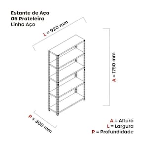 Estante de aço Pandin tem a melhor qualidade do mercado, porque são confeccionadas em chapas #20 e #26 (0,90mm e 0,45mm) priorizando sempre a qualidade, segurança e bem-estar no dia a dia dos nossos clientes. Acabamento da Prateleira: Pintura Acabamento dos Pés: Pintura Altura dos Pés: 3 Ambiente Principal: Escritório Complexidade da Montagem: Baixa: pode ser montado por uma pessoa sozinha Cor: Laranja Picasso Cor do Produto: Laranja Picasso Cor Flex: Laranja Picasso Cor Interna: Laranja Picasso Escala de Brilho: Semi-Brilho Escala de Brilho da Prateleira: Semi-Fosco Itens Inclusos: 1 Estante com 5 prateleiras Linha ou Coleção: Aço Manual de Montagem e Instalação: https://cdn2.madeiramadeira.com.br/atributo/pandin/1315190-estante-v-u-05-prateleiras.pdf Material da Prateleira: Aço Material dos Pés: Polipropileno Material Principal: Aço Necessita Montagem: Sim Origem do Produto: Nacional Painel para TV Integrado: Não Peso: 12.45 Peso Máximo por Prateleira: 20 Possui Espelho: Não Possui Possui iluminação: Não Possui Pés: 04 Possui Portas: Não Possui Prateleiras: 05 Possui Vidro: Não Quantidade de Nichos: 01 Recomendações de Uso, Manutenção e Limpeza: Utilizar um pano levemente umedecido com água, para finalizar utilizar um pano seco. Sapatas Niveladoras: Sim Sistema de Montagem: Parafuso Suporta Até (kg): 20