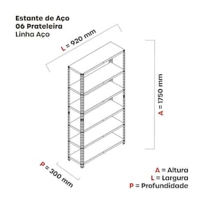 Estante de aço Pandin tem a melhor qualidade do mercado, porque são confeccionadas em chapas #20 e #26 (0,90mm e 0,45mm) priorizando sempre a qualidade, segurança e bem-estar no dia a dia dos nossos clientes. Acabamento da Prateleira: Pintura Acabamento dos Pés: Pintura Altura dos Pés: 3 Ambiente Principal: Escritório Complexidade da Montagem: Baixa: pode ser montado por uma pessoa sozinha Cor: Preto Cor do Produto: Preto Cor Flex: Preto Cor Interna: Preto Escala de Brilho: Semi-Fosco Escala de Brilho da Prateleira: Semi-Fosco Itens Inclusos: 1 Estante com 6 prateleiras Linha ou Coleção: Aço Manual de Montagem e Instalação: https://cdn2.madeiramadeira.com.br/atributo/pandin/1318735-estante-v-u-06-prateleiras.pdf Material da Prateleira: Aço Material dos Pés: Polipropileno Material Principal: Aço Necessita Montagem: Sim Origem do Produto: Nacional Painel para TV Integrado: Não Peso: 9.83 Peso Máximo por Prateleira: 20 Possui Espelho: Não Possui Possui iluminação: Não Possui Pés: 04 Possui Portas: Não Possui Prateleiras: 06 Possui Vidro: Não Recomendações de Uso, Manutenção e Limpeza: Utilizar um pano levemente umedecido com água, para finalizar utilizar um pano seco. Sapatas Niveladoras: Sim Sistema de Montagem: Parafuso Suporta Até (kg): 20