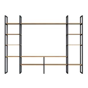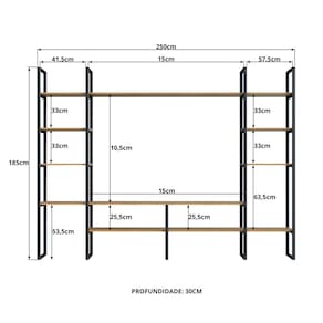 Com design industrial, ela combina a robustez da estrutura em ferro preto com a elegância das prateleiras em MDF amadeirado, criando um visual versátil e atemporal.