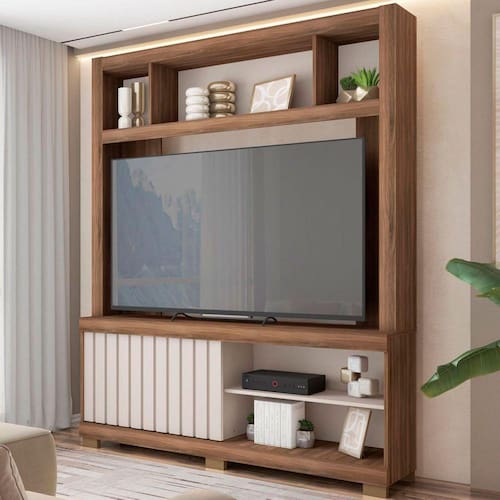 O(a) Estante para TV Até 55 Polegadas 1 Porta com Ripado Cinne Nogueira San Remo/Off White - Caemmun é produzido em MDP na escala de brilho Fosco, e possui um grau de dificuldade de montagem: Médio.
