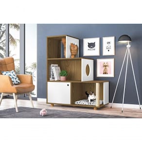 ESTANTE PET SIAMÊS MEL FREIJO/BRANCOA Estante Pet Siamês é um móvel para que o seu gatinho possa fazer parte da decoração da sua sala ou qualquer ambiente do seu lar com um espaço confortável para ele participar com você de alguns momentos e brincar. Tem como diferencial um elemento vazado com a carinha de um gato, caracterizando o seu animalzinho, mais um elemento vazado na lateral na forma de um círculo para que ele possa entrar e sair de um lado para o outro e para completar um arranhador de sisal para ele se divertir. Possui uma porta de rotação com dobradiças metálicas e quatro prateleiras. Os pés são em madeira envernizada e uma almofada de tecido, bem confortável. Cor: Mel Freijo / BrancoDimensões (AXLXP): 106 x 85 x 42 cmPeso do produto montado: 25kgEstrutura do produto: MDP E MDF 15MMAcabamento(s): Pintura UVEscala de Brilho: AcetinadoPeso máximo suportado (Kg): 40kgGarantia: 3 MesesRecomendações de manutenção: Limpeza com pano umedecido. Não aplicar lustra móveis.Produto necessita montagem?: SimSistema de montagem: Parafusos e MinifixQuantidade de Pés: 5Tipo dos Pés: MadeiraAltura dos Pés: -Rodízios: -Quantidade Gavetas: Não possuiTipo Corrediça: -Quantidade de Portas: 1 portaTipos das Portas: rotaçãoTipos de Dobradiças: metálicasPuxadores: não possuiTipo Puxador: -Passa Fio: não possuiPrateleiras: 4Tipos de Prateleiras: fixaDistância máxima e mínima entre prateleiras: 32cmNichos: 3 nichosEspaço P/ TV: NãoTamanho máximo da TV que pode ser utilizada (em polegadas): -Acompanha suporte para TV: NãoEstante Pet SiamÃs Mel Freijo/branco