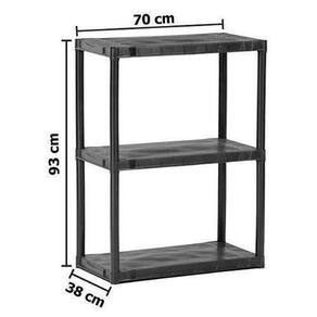 Estante Plástica 3 Prateleiras PretoEstante Plástica 3 Prateleiras Ideal para lavanderias, áreas de serviços, garagens e depósitos Fácil de montar, basta encaixar os tubos nas prateleiras sem a necessidade de ferramentas. Medidas - Altura 93,0 x Largura 70,0 x Profundidade 38,0 cm Vão Livre entre as prateleiras - 39 cm altura Capacidade de peso - 10 kg por prateleira Fabricado em Polipropileno Cor - Preto