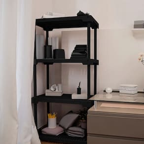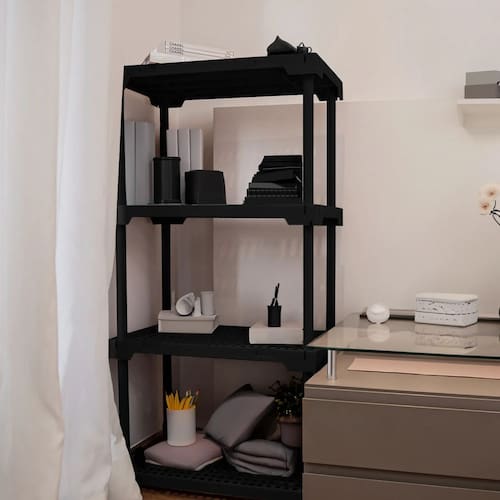 Transforme seu espaco com a Estante Multiuso Poly, uma solucao inteligente e elegante para organizacao. Seu design moderno em polipropileno preto se integra perfeitamente a qualquer ambiente, oferecendo um visual clean e sofisticado. Com 127cm de altura, 70cm de largura e 35cm de profundidade, suas quatro prateleiras amplas garantem um amplo espaco para acomodar seus pertences de forma ordenada e acessivel.