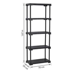Fabricada em polipropileno de alta resistencia, esta estante garante durabilidade e suporta ate 125kg distribuidos uniformemente em suas cinco prateleiras. O material e facil de limpar, resistente a umidade e a corrosao, o que a torna uma escolha inteligente para ambientes variados. Sua montagem e descomplicada, permitindo que voce a utilize rapidamente.