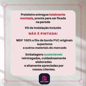 Estante porta bonecas nicho parede organizador coleção brinquedos prateleira quarto infantil mdf 55cm Ripa: branca Deixe uma criança, ou um colecionador feliz ao adquirir uma prateleira feita pensada nas medidas de bonecos estilo super herói e barbie preciso montar É complicado de instalar Não se preocupe as prateleiras já vão montadas e prontas para instalar. Enviamos com buchas e parafusos, então é só fixar na parede. Simples, rápido e sem dor de cabeça. será que é resistente mesmo Sim fabricadas em mdf 15mm com acabamento melamínico, nossas prateleiras suportam até 8 kg cada com tranquilidade. É qualidade testada e aprovada por centenas de clientes. e se não combinar com meu ambiente A cor amadeirada e o design minimalista combinam com qualquer estilo de decoração - do clássico ao moderno. Ideal para quarto, brinquedoteca , sala, creche, escola... E até quarto de bebê. vai valer a pena mesmo Você recebe 1 prateleira pronta para uso, com design artesanal, duráveis e versátil. Use para organizar e decorar com estilo, sem gastar muito e sem depender de móveis planejados. é confiável comprar da arte cedro Sim produzimos de forma artesanal e com atenção aos detalhes. Nosso compromisso é com a sua satisfação e com o charme da sua casa. A prova disso A fidelidade dos nossos clientes e os elogios que recebemos todos os dias. Detalhe: não é pintada mdf . Medidas: 55 cm de comprimento 7,5 cm de profundidade 20 cm de altura O que vem: 1 prateleira de 55cm. Faça seu pedido agora e transforme seu espaço com praticidade e estilo Arte cedro: o detalhe na sua decoração. Marca: Não Informado