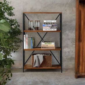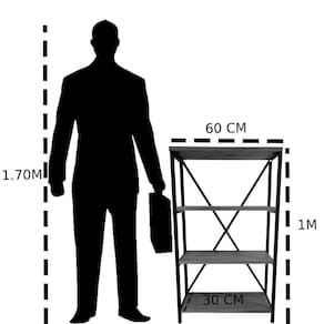 Material: Madeira Maciça e Ferro Dimensões: Altura: 1m | Comprimento: 60cm | Profundidade: 30cm Cor: Ferro preto com acabamento eletrostático; madeira natural Estilo: Industrial Número de Prateleiras: 4 Montagem: Não Requer Origem: Produto artesanal feito à mão Garantia: 90 dias após a entrega da mercadoria.