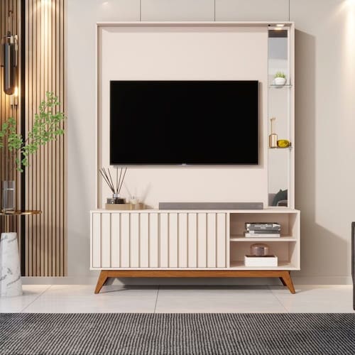 O home ripado exclusivo da linha açaí tem a estrutura (tampo, base, portas, laterais e prateleira) em MDF 1,5cm, portas ripadas em MDF de 1,8cm com dobradiças, pés e travessas em madeira maciça, prateleiras de vidro e detalhes com espelho além de luminárias com led. Produto Montado: Sim Acabamento da Porta: Pintura UV Acabamento da Prateleira: Vidro Acabamento dos Pés: Pintura Acompanha Lâmpada: 02 Altura do Espelho: 44 cm Altura dos Pés: 15,5 cm Altura Máxima dos Pés: 15.5000 Ambiente Principal: Sala de Estar codigo_ean: 7900288119940 Complexidade da Montagem: Alta: deve ser montado por um montador especializado Cor: Off White Cor do Produto: Off White Cor Flex: não Cor Interna: Off White Escala de Brilho: Semi-Brilho Escala de Brilho da Porta: Semi-Brilho Escala de Brilho da Prateleira: Não Possui Espessura do Espelho: 3 mm Espessura do Painel: 1,5 cm Espessura do Tampo: 15 mm Espessura do Vidro: 4 mm Fita Integrada: Não Fixação na Parede: Não Formato do Espelho: Retangular Ideal para TVs até (Polegadas): 60 Itens Inclusos: 1 Estante, Manual de Montagem e Kit Ferragens Largura do Espelho: 6,3 cm Linha ou Coleção: Linha 2025 Manual de Montagem e Instalação: https://product-hub-prd.madeiramadeira.com.br/976654/documents/4ba5f5a4-2ade-4f06-9373-06d57e1f3fb02666000540417387599142996.pdf Marca: JB Bechara Material da Porta: MDF Material da Prateleira: Vidro Material do Puxador da Porta: MDF Material dos Pés: Madeira Maciça Material Principal: MDF Montagem Flex: não Necessita Montagem: Sim Origem do Produto: Nacional Peso: 53 kg Peso Máximo por Prateleira: 2 kg Possui Espelho: Sim Possui iluminação: Sim Possui Nichos: 02 Possui Passa Cabos: Sim Possui Pés: 04 Possui Rodízio: Não Possui Vidro: Sim Quantidade de Espelho: 02 Espelhos com Tamanhos Iguais Recomendações de Uso, Manutenção e Limpeza: Na remoção da poeira utilize flanela limpa e levemente umedecida. Não exponha à luz solar e locais úmidos. Não encoste o móvel na parede para evitar transmissão de umidade. Sapatas Niveladoras: Não Sistema de Montagem: O produto será entregue desmontado, acompanhado do manual de montagem. Não oferecemos serviço de montagem. A montagem e instalação é por conta do cliente. Recomendamos a contratação de um profissional. Não nos responsabilizamos por danos decorrentes a e Suporta Até (kg): 25 kg Suporte de TV Universal Incluso: Não Tipo de Fixação do Espelho: Fita Dupla Face Tipo de Madeira Maciça dos Pés: Pinus Tipo de Puxador da Porta: Embutido